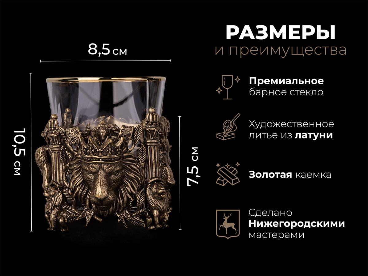 Бокал сделан в виде 4-х могущественных стен, которые украшены колоннами и львами. На лицевой стороне расположена самая главная и крупная голова льва в короне, который ассоциируется с силой и властью, ведь этот зверь всегда считался самым могущественным.