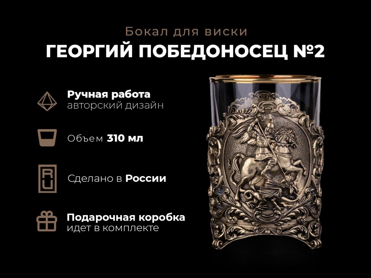 На лицевой части бокала изображен Георгий Победоносец, который стал важным символом нашей страны, ведь он используется на гербе РФ, гербе Москвы, на монетах, иконах, орденах и т.д. Данный бокал является универсальным подарком, который подойдет для любого события.