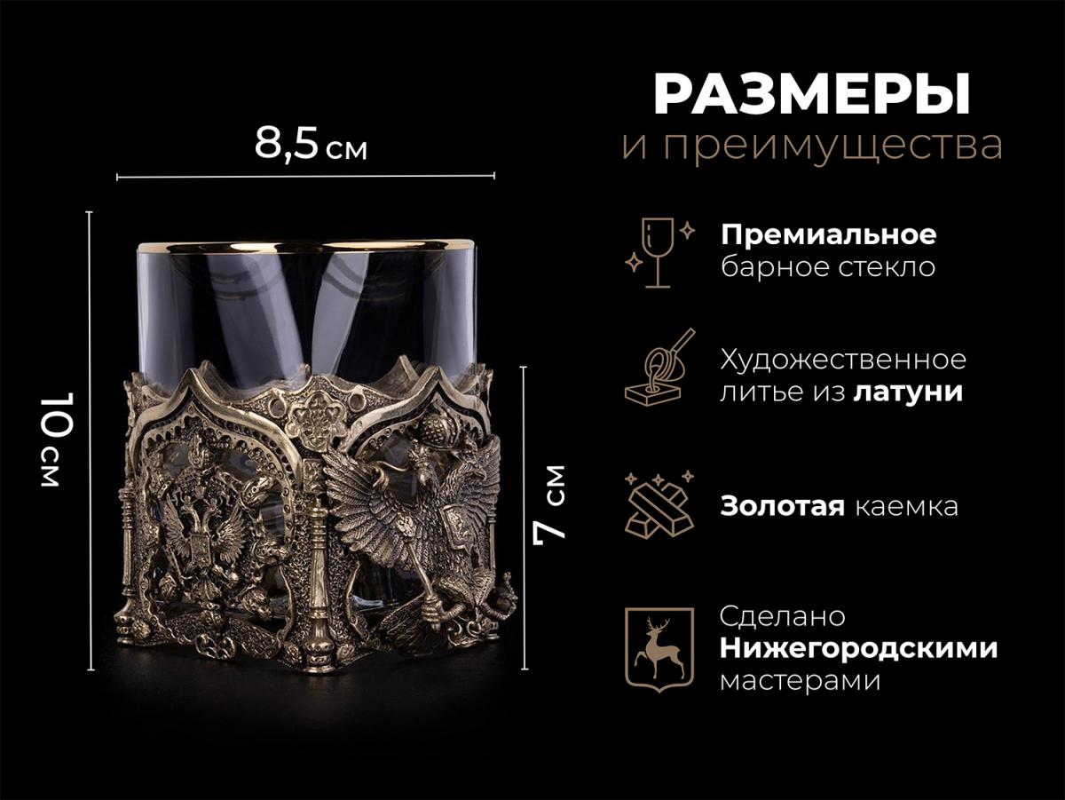 Бокал для виски Герб - солидный подарок руководителю, патриоту или человеку связанному с гос. службой. С каждой стороны изображен двуглавый орел в разном исполнении. Напиток в таком стакане однозначно будет приятно пить!
