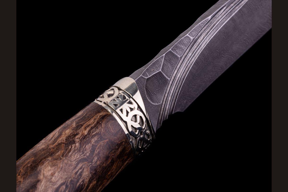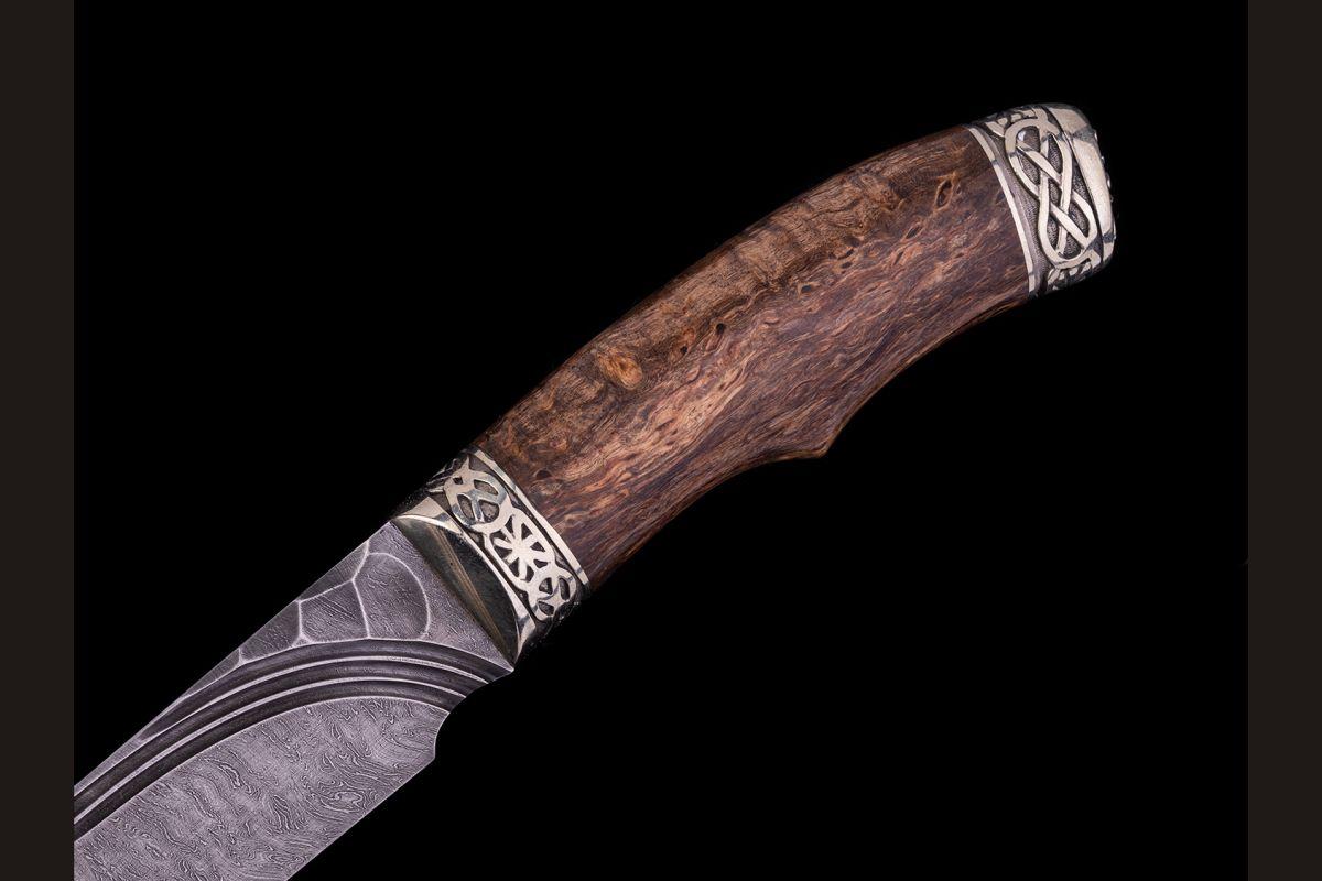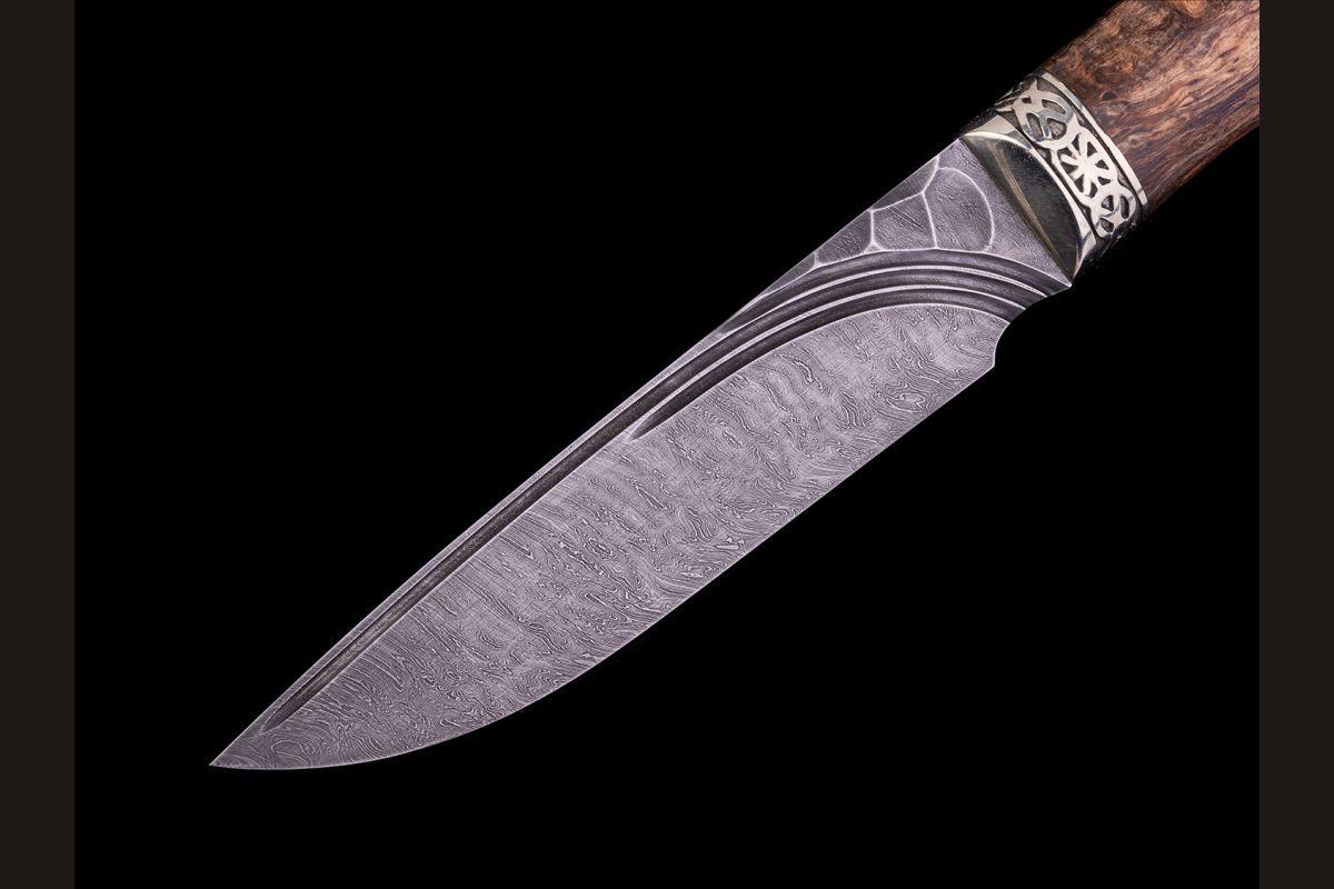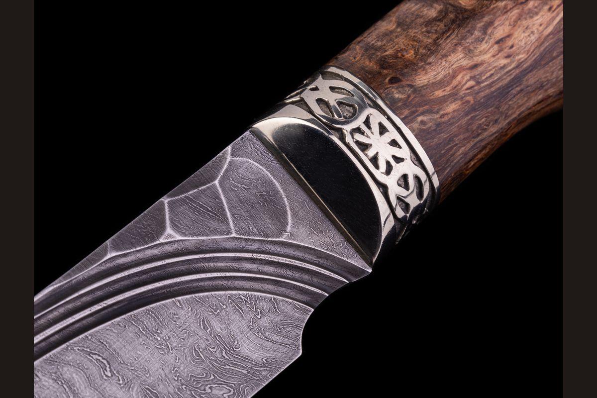 Купить Нож Лиса (дамаск, долы - камень, стабилизированная карельская берёза, литьё мельхиор) в интернет-магазине Три путника.