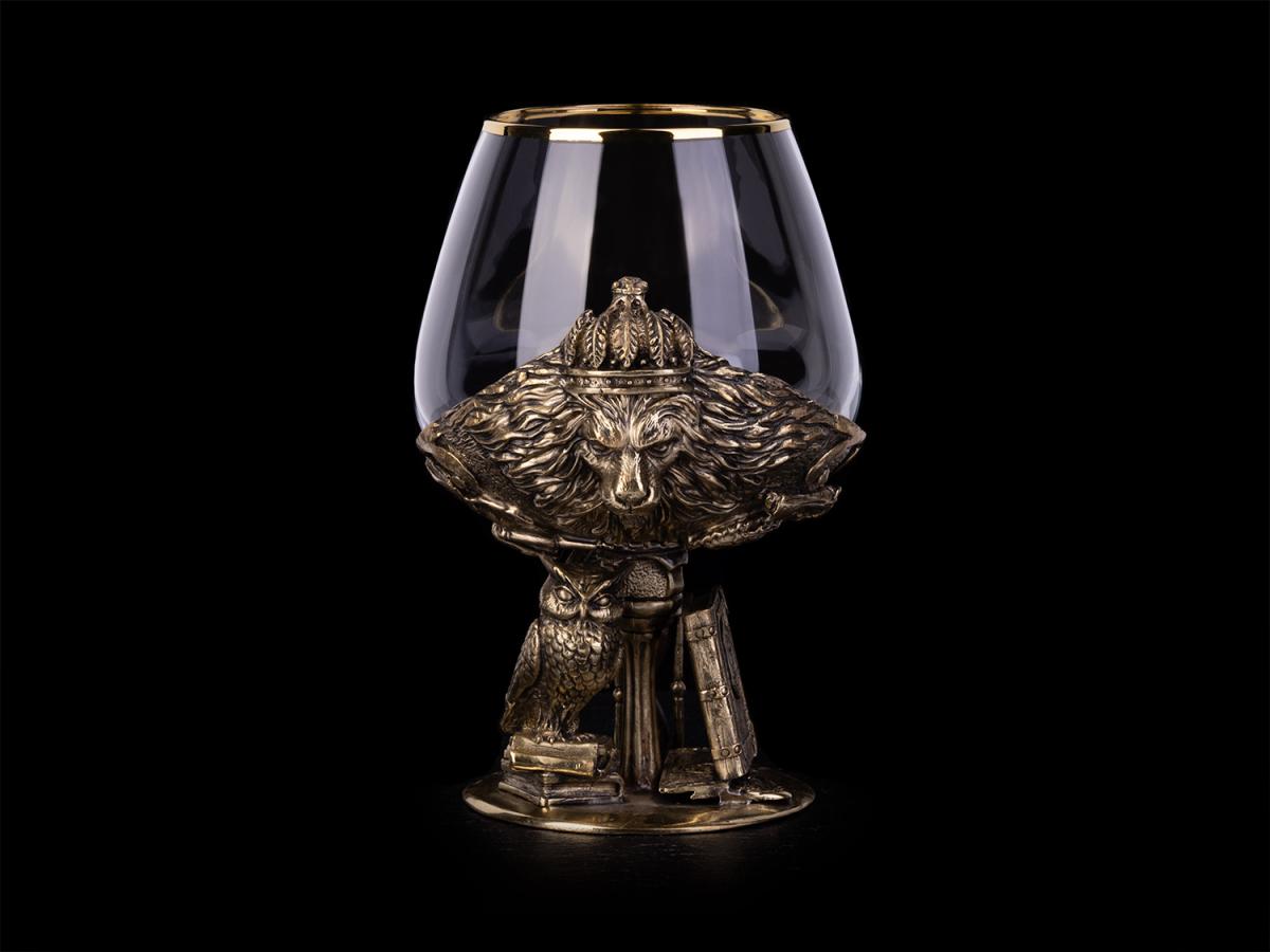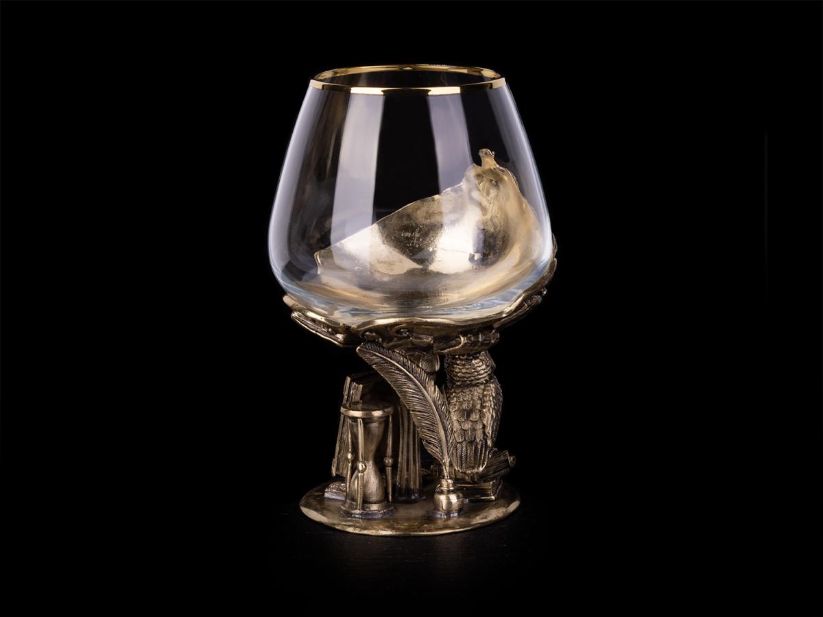 Художественное литье на бокале выполнено из латуни – многокомпонентного сплава металлов, который стал очень популярным для создания тонких изделий ручной работы благодаря своей податливости в обработке.