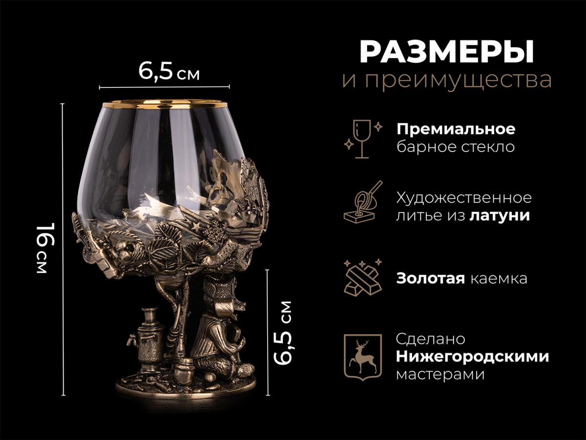 Все детали, включая сам самовар и медведя, выполнены из латуни, что делает товар не только прочным, но и придает благородный блеск. Также в центре бокала располагается красивый, мощный герб.