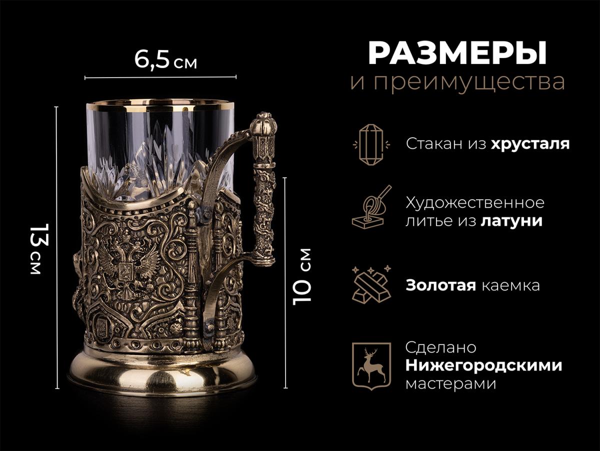 Подарок, который впечатлит особым вниманием к деталям и яркой историей! Подстаканник состоит из двух частей: прочного латунного корпуса и съемного хрустального стакана. Вы с легкостью можете насладиться своим любимым напитком и без труда вымыть стакан после использования. Центральная композиция подстаканника привлекает внимание: сцена, где Георгий на коне побеждает змея. Это символ победы добра над злом, проявление храбрости и благородства — качества, вдохновляющие на великие дела.