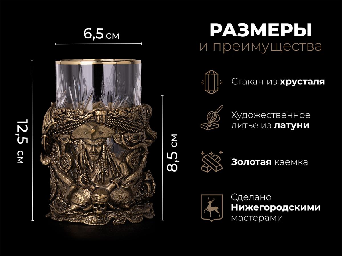 В центре композиции величественный пират, готовый к новым захватывающим приключениям. Ниже — мрачный череп, пронзенный мечами, как напоминание о суровых испытаниях. Слева — величественный парусник, несущийся на всех парусах навстречу ветрам. Под кораблем — золотая монета с черепом, символизирующая пиратские сокровища. Справа — озорная обезьянка. И, конечно, осьминог, охраняющий сокровища. Все детали подстаканника выполнены из латуни, а стакан выполнен из хрусталя.