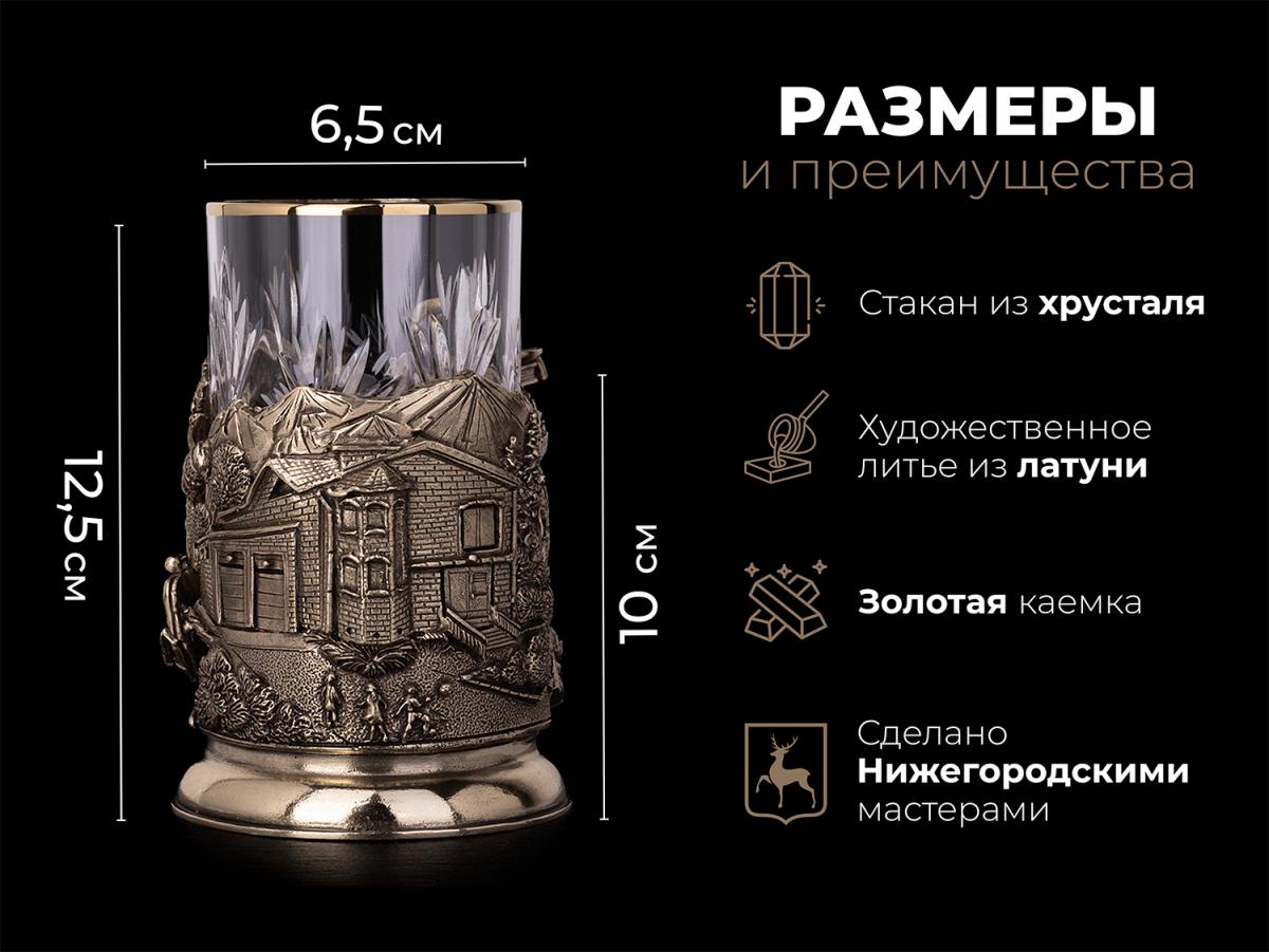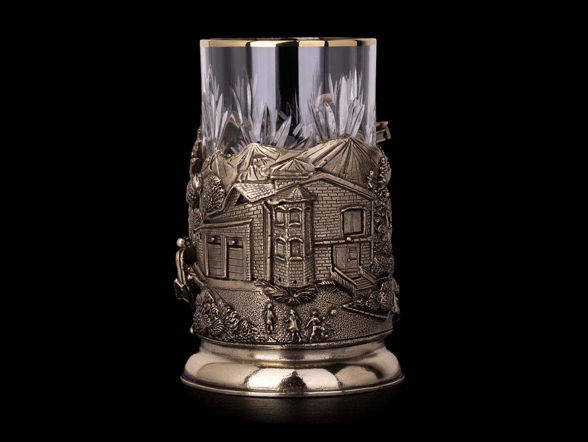 Подстаканник выполнен из латуни и дополнен съемным хрустальным стаканом, который легко мыть. В центре композиции — изображение большого красивого дома, около котого резвятся дети, играя в мяч, символизирующее семейное счастье и уют. Слева и справа — атрибуты богатой жизни: планета, костюм, книги, самолёт, машина и часы, которые подчеркивают амбиции и достижения владельца.