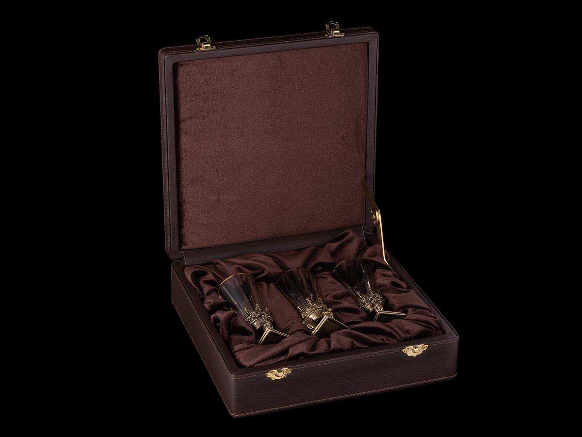 В комплекте с лафитниками идет подарочная коробка из дизайнерского картона с мягким ложементом и яркой атласной тканью. Дополнительно вы можете заказать стильный кейс из кож. зама с прочными ручками и мягким наполнением внутри.